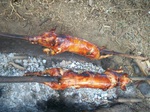 En nuestro rancho de Palo-Gordo, mantenemos la tradición familiar de matar al puerco el mismo dia, después de haberlo engordado hasta alcanzar alrededor de los 30kg. Inelvis, la veterinaria de la familia, lo analiza en seguida para certificar que sea apto para ser comido, y una vez vaciado y preparado, se empala en púa de madera y se acomoda en el horno artesanal para ser asado con leña, turnando la labor de girar manualmente con la manivela al cerdo para ser cocido en su totalidad, entre trago de ron y partida eterna de dominó de 8 fichas, el típico del Oriente cubano.