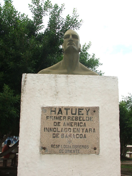 Hatuey fué un cacique Taino procedente de la isla La Española (actual Haití y Santo Domingo), quien ya conocía los crueles métodos de los conquistadores españoles, y huyendo de su lugar natal, atravesó el mar y se refugió en las montañas de Baracoa, alertando a la vez y llamando a la rebelión a los aborígenes de la zona. La resistencia duró bien poco (se calcula que alrededor de 30 días) debido a la superioridad armamentística española, y fue capturado para posteriormente ser quemado en la hoguera a instancias de la Santa Inquisición Católica contra los herejes.